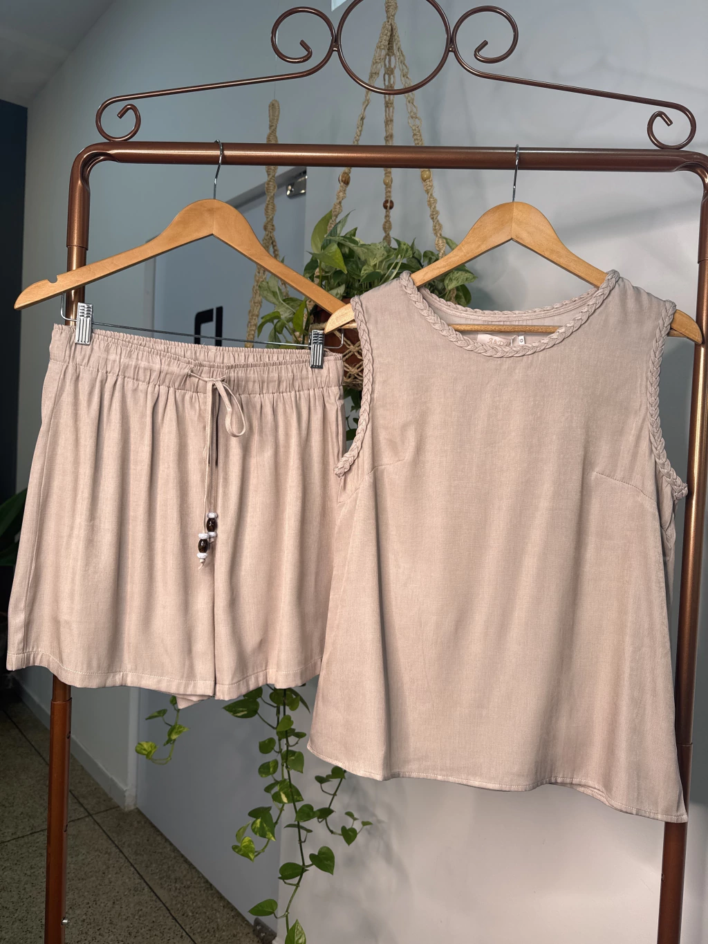 Conjunto de short e regata em liocel, tecido de toque macio e caimento leve, que proporciona conforto e sofisticação natural. Com design clean e acabamento refinado, é ideal para produções casuais elegantes, unindo frescor, versatilidade e estilo atemporal.